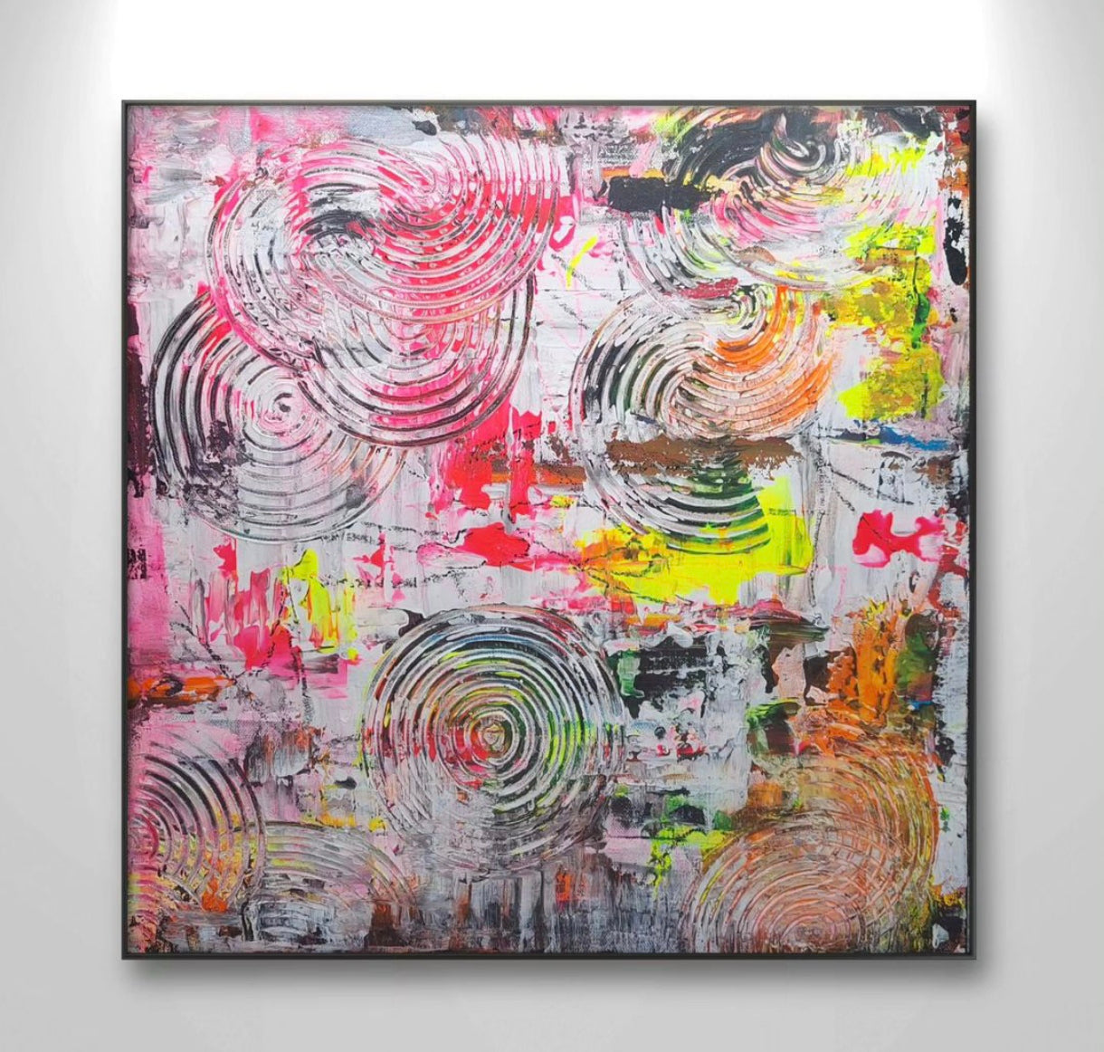 The partially thickly applied paint, combined with powerful textures and rhythmic circular shapes, creates a sense of movement and energy. The color palette—with accents of pink, yellow, orange, and black—creates a modern yet urban feel.