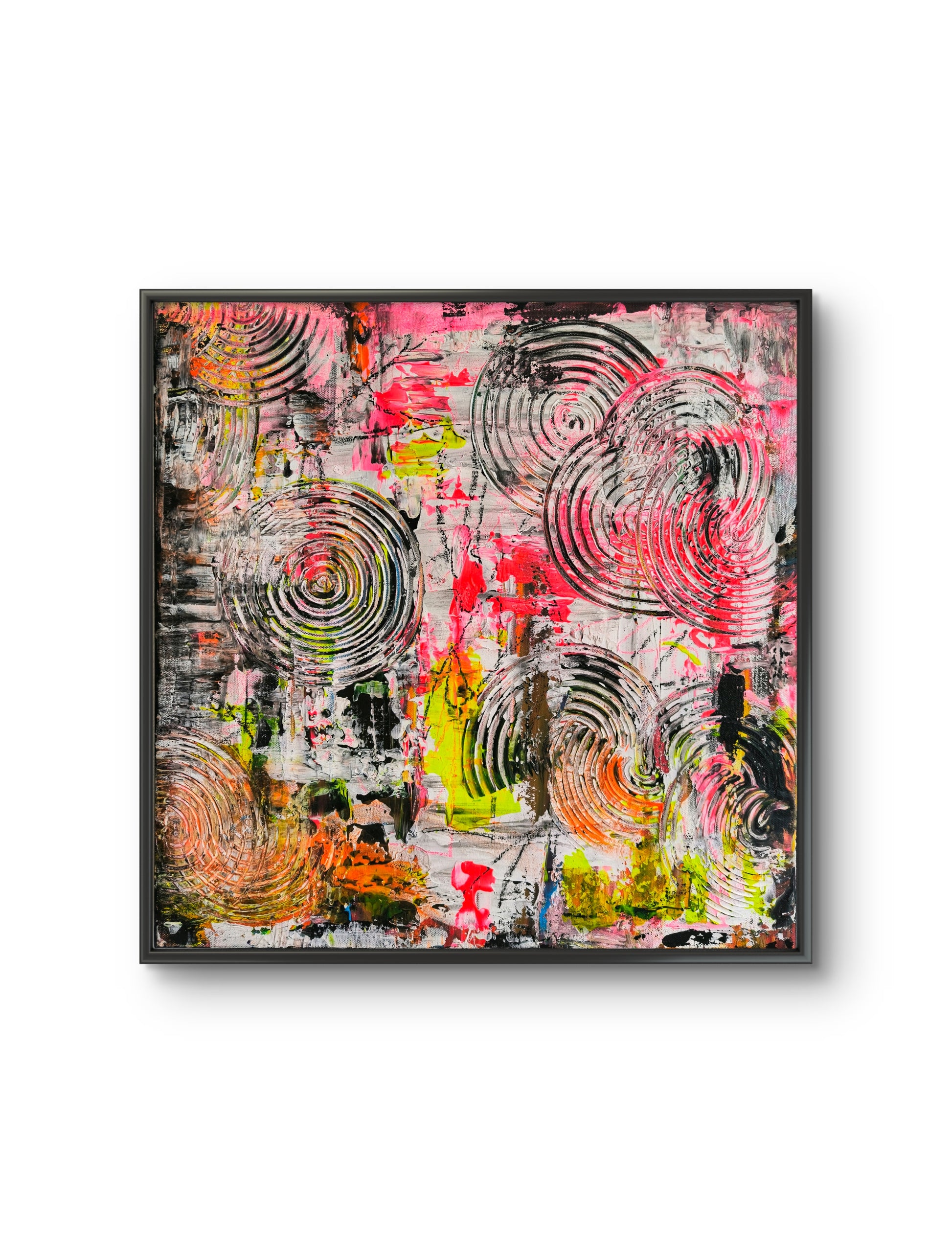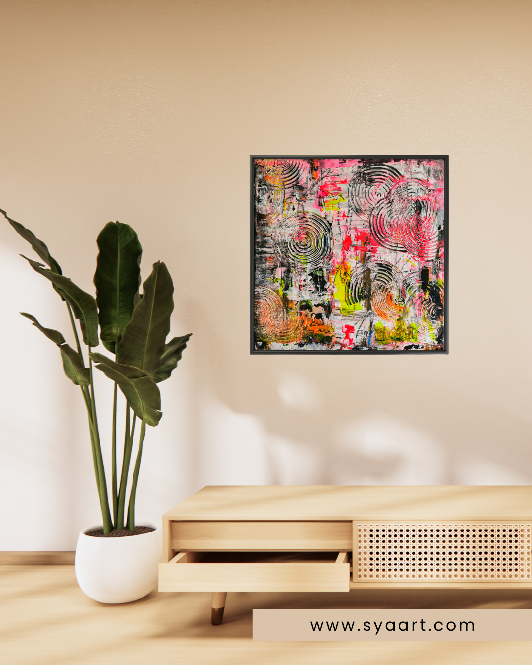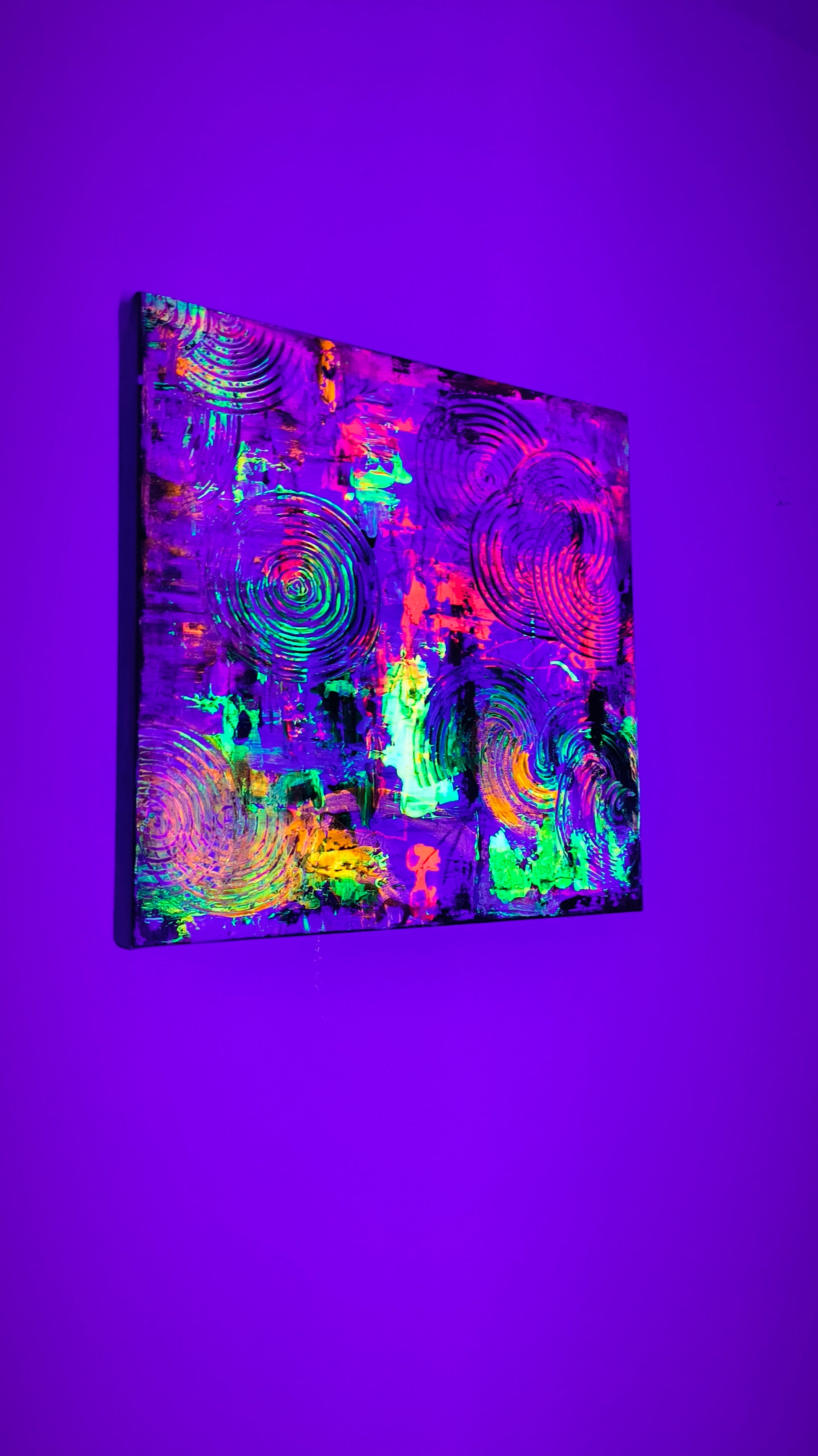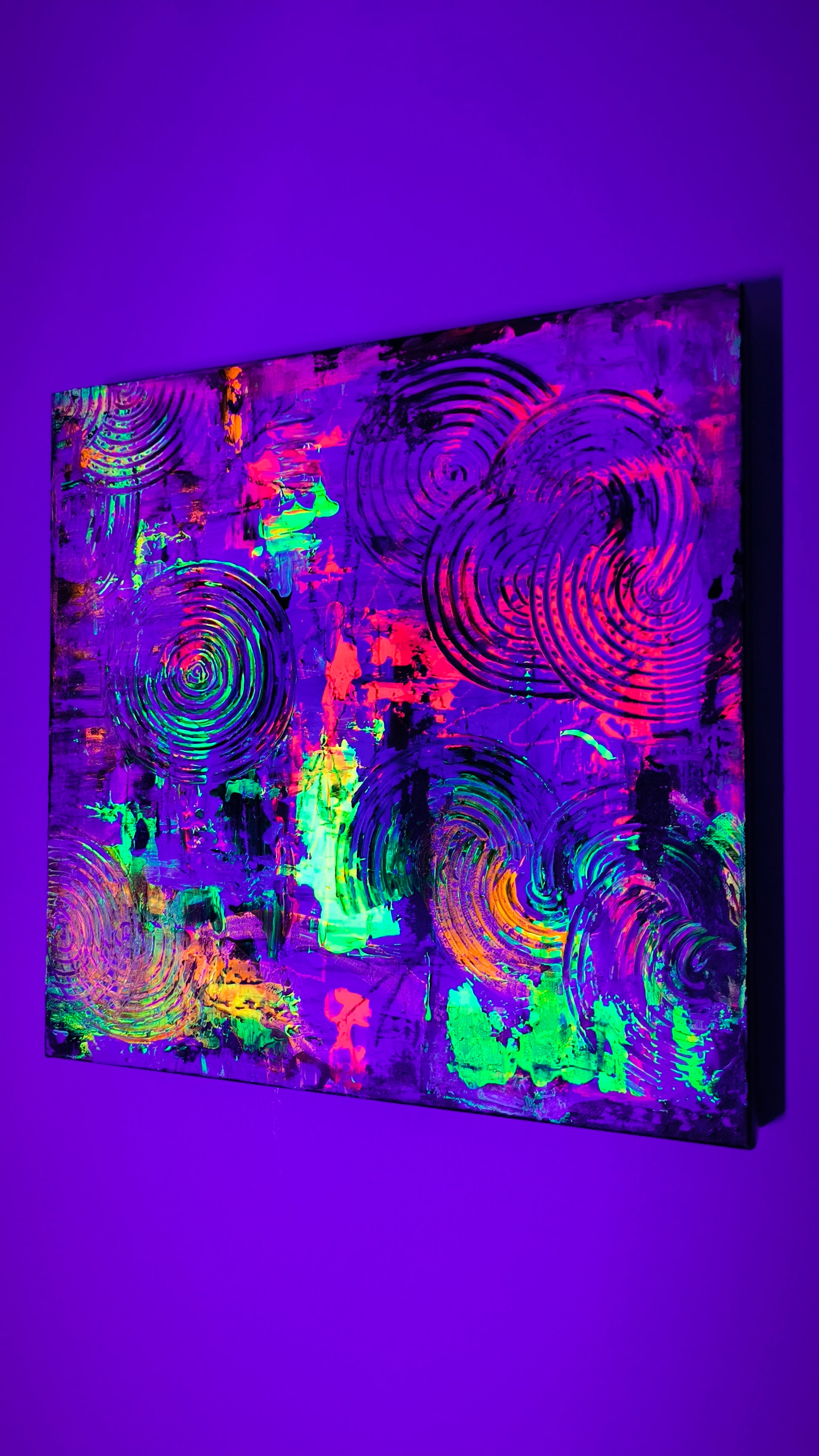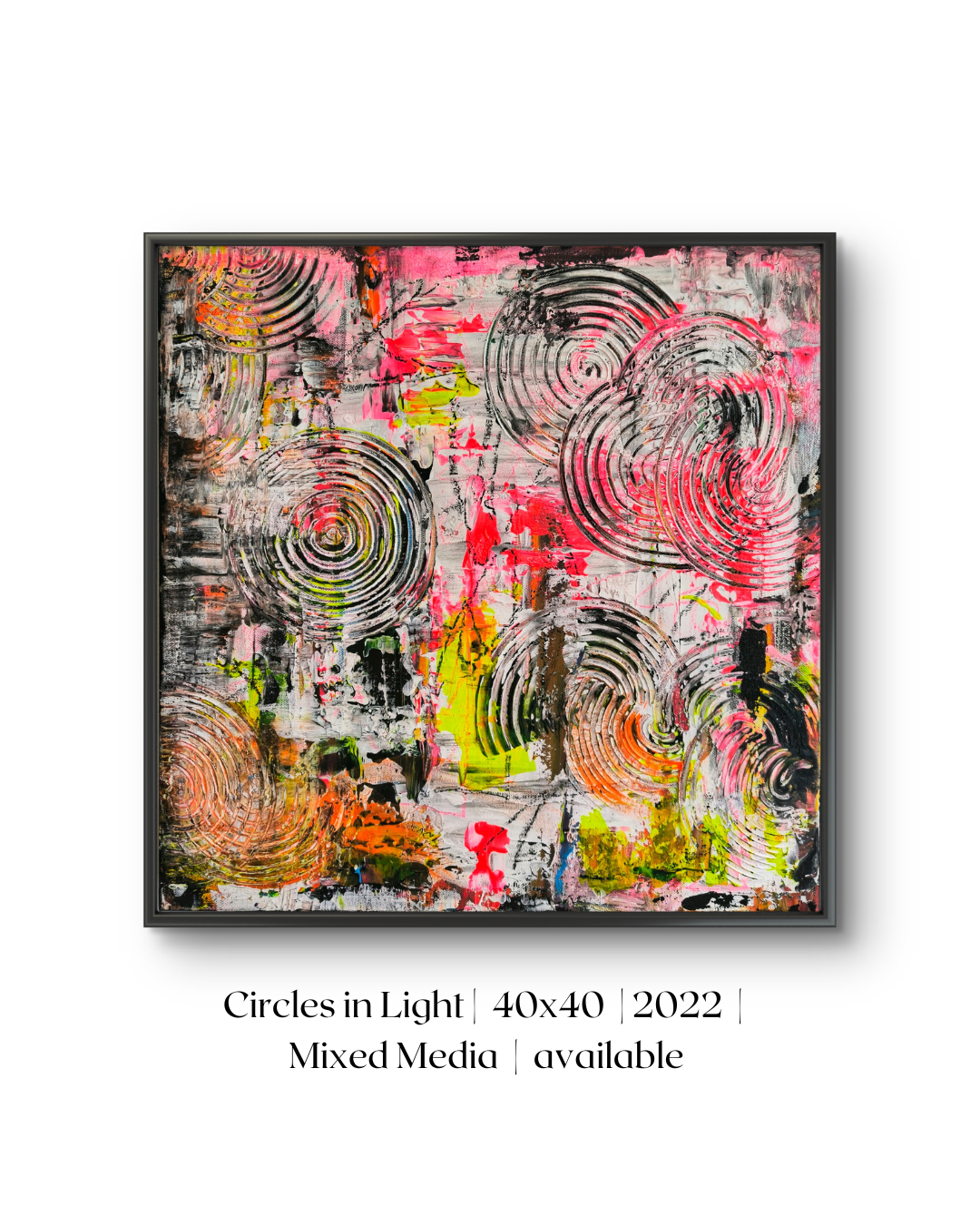 Immerse yourself in a vibrant interplay of color, texture, and light. "Circles in Light" is a mesmerizing mixed-media artwork that creates a powerful visual impact with vibrant neon colors and dynamic circular structures.