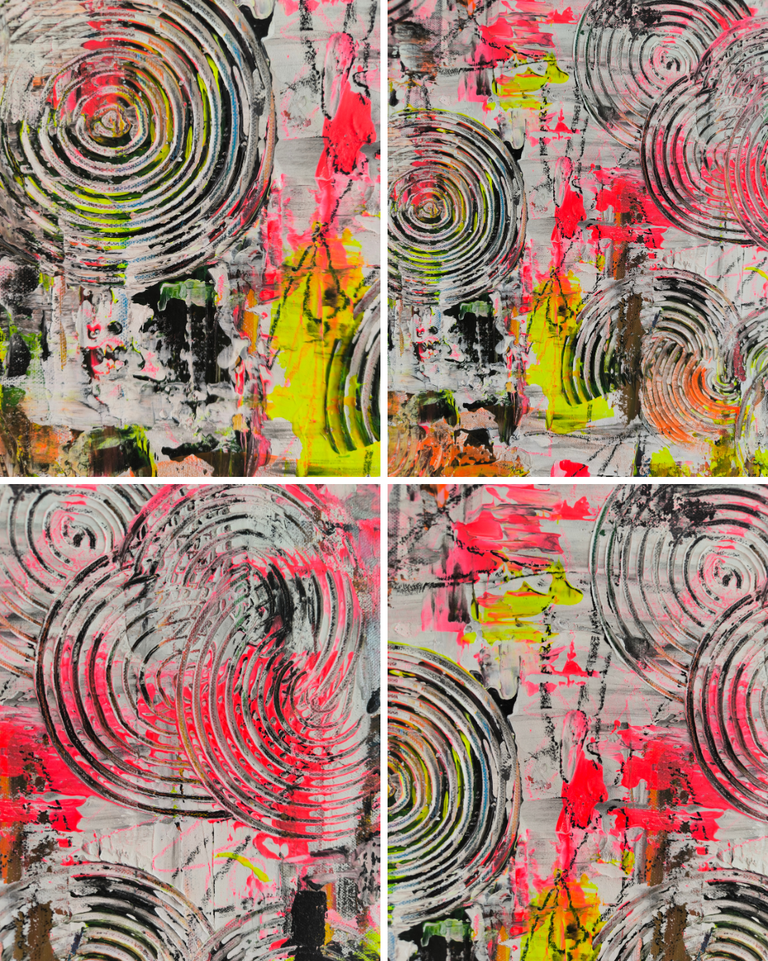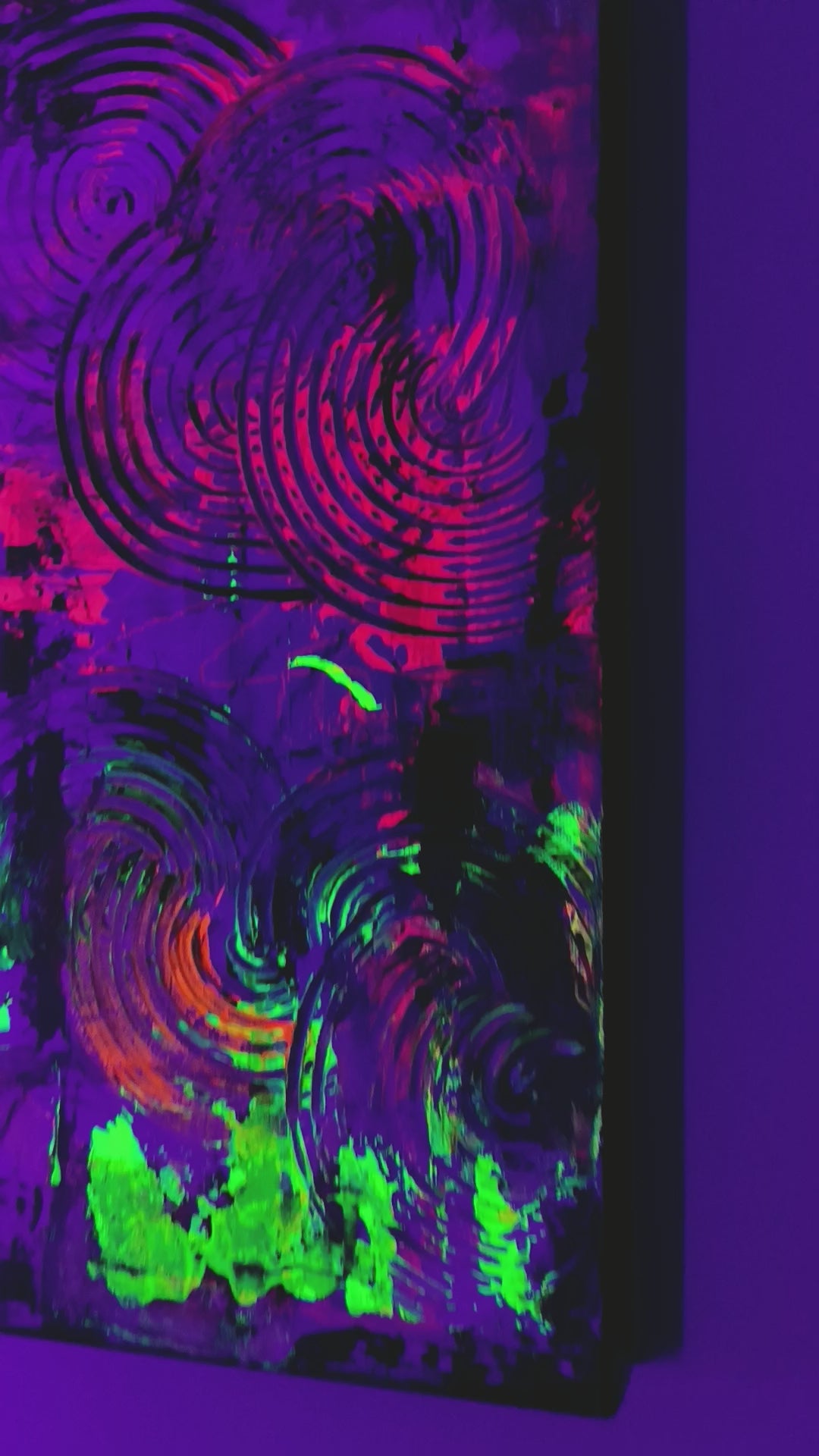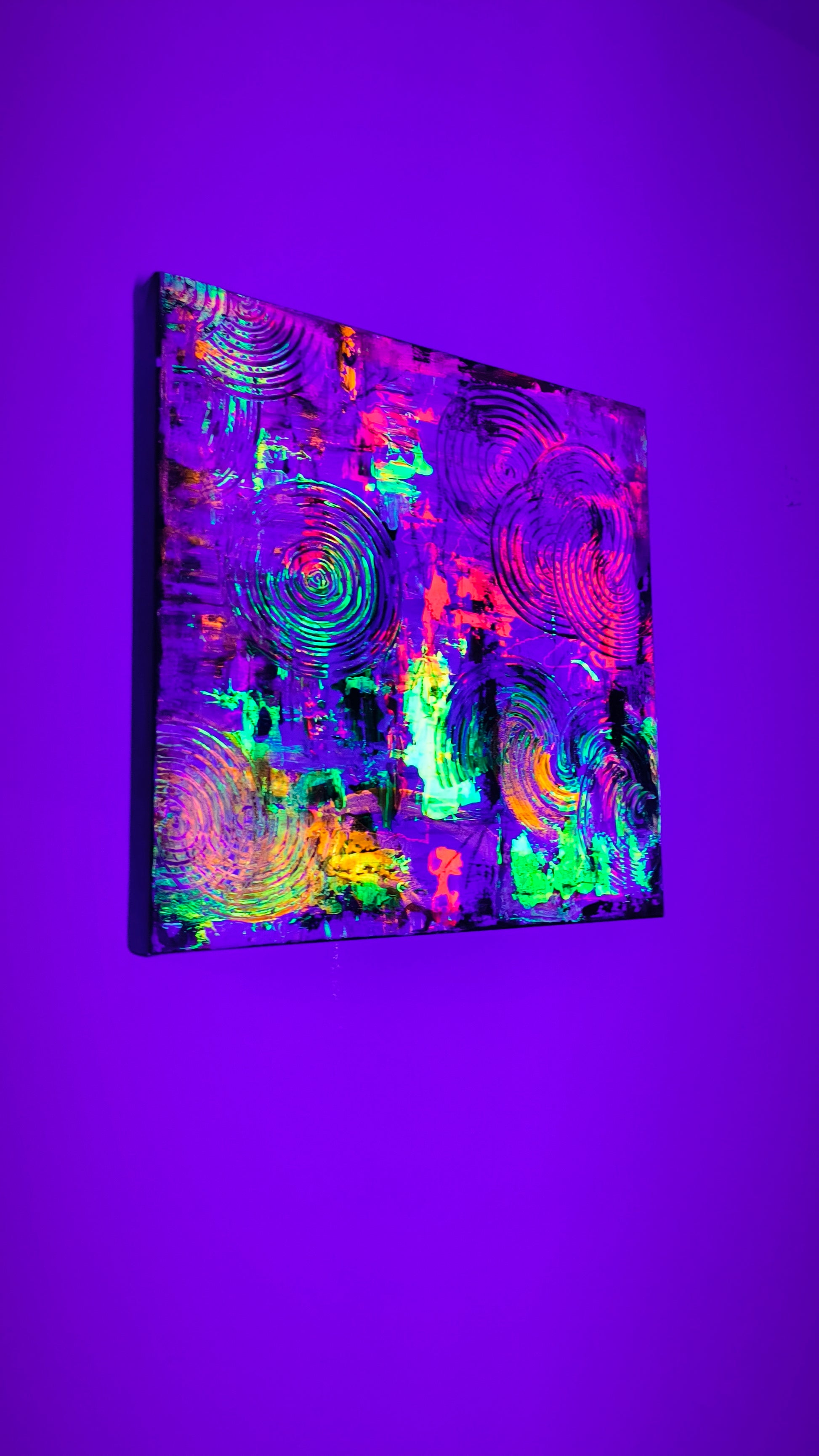 Particularly noteworthy: The neon pigments used are fluorescent and begin to glow intensely under black light (UV light) or blue light – an impressive effect that takes the work into a whole new dimension in darker environments.